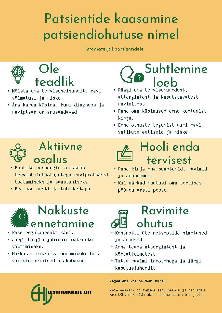Eesti Haiglate Liit on koostanud patsientidele suunatud infomaterjali, mis hõlmab patsiendi kaasamise olulisemaid aspekte. Hea patsient, pea meeles: